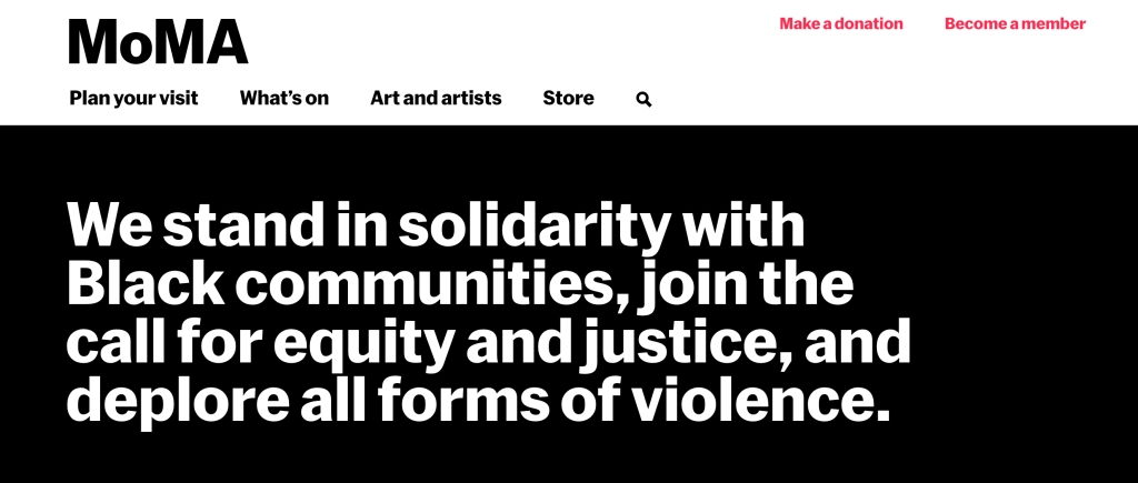However, it is worth considering how different museums, in their transfer to online channels as their primary public facing mode of utterance, are also opening up a similar scale-shift – from an on-line temporary distribution of art works and related materials, to specifying the stakes of, or claiming positions within, the current historical moment. MOMA again (notoriously a ‘white’, ‘white cube’) is a useful example here.