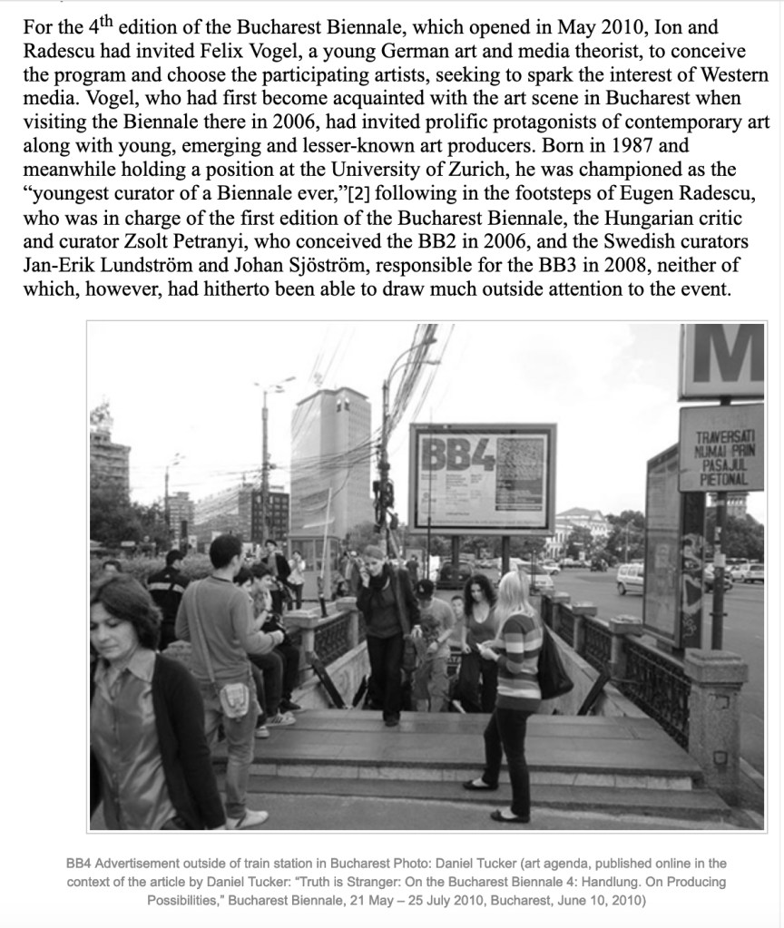 Gardner, Belinda Grace (2013) “Learning from Bucharest: Rethinking ‘white spots’ of art production in Central and Southeastern Europe” Seismopolite Journal of Art and Politics. A discussion of the 2010 Bucharest Biennale with specific reference to the curatorial arrangements for BB4, 5 and 6.”